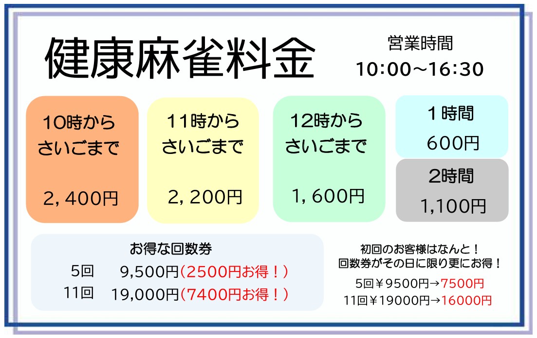 | ゲーム代 | 1ゲーム500円オープンからラストまで打っても上限2,200円!! ※1ゲーム料金 女性:400円 学生:300円 |